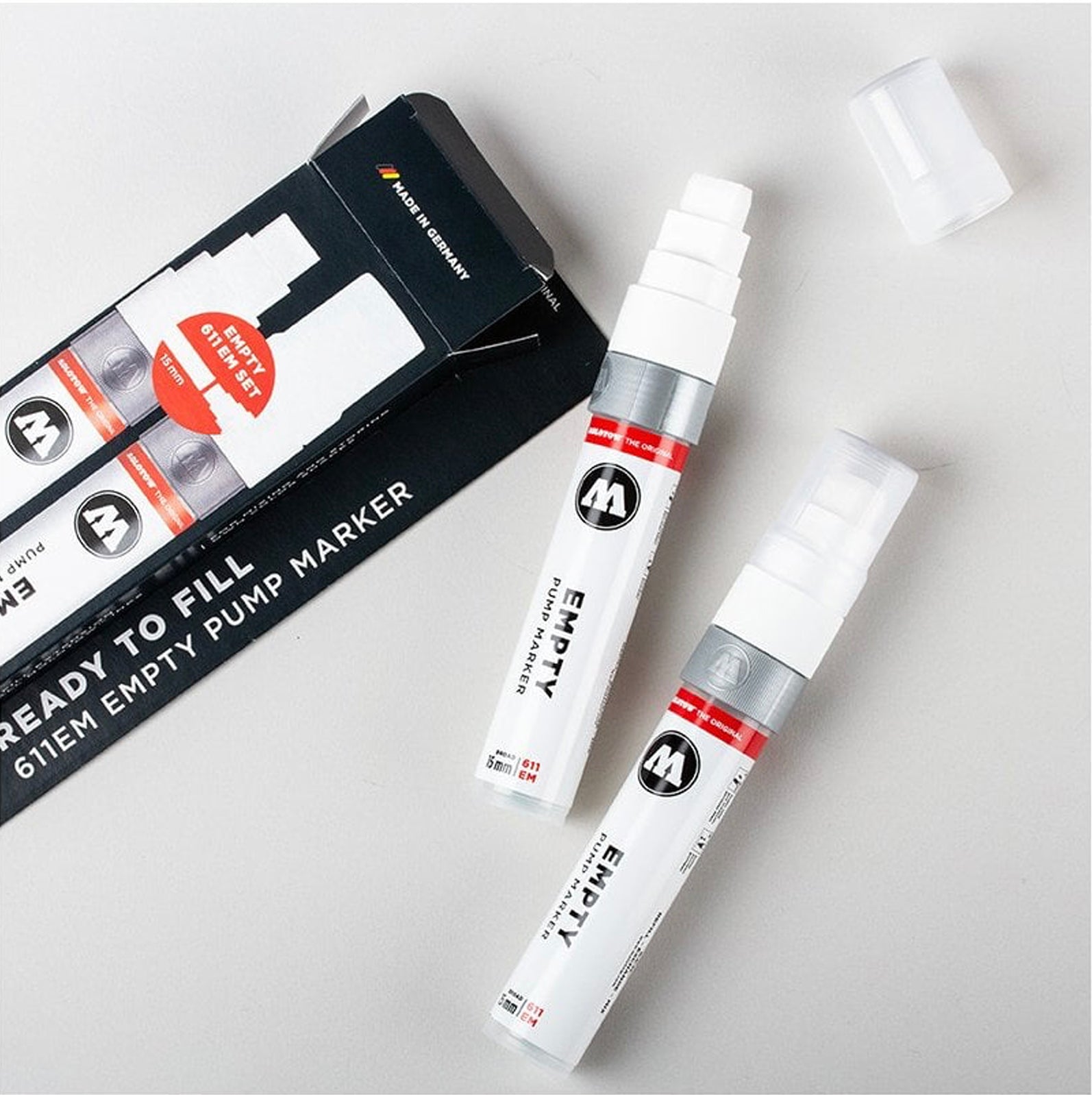 The Empty Marker 611EM 15mm Starter Kit with 2 markers including pre-mounted Refill Extension in sustainable cardboard packaging.
