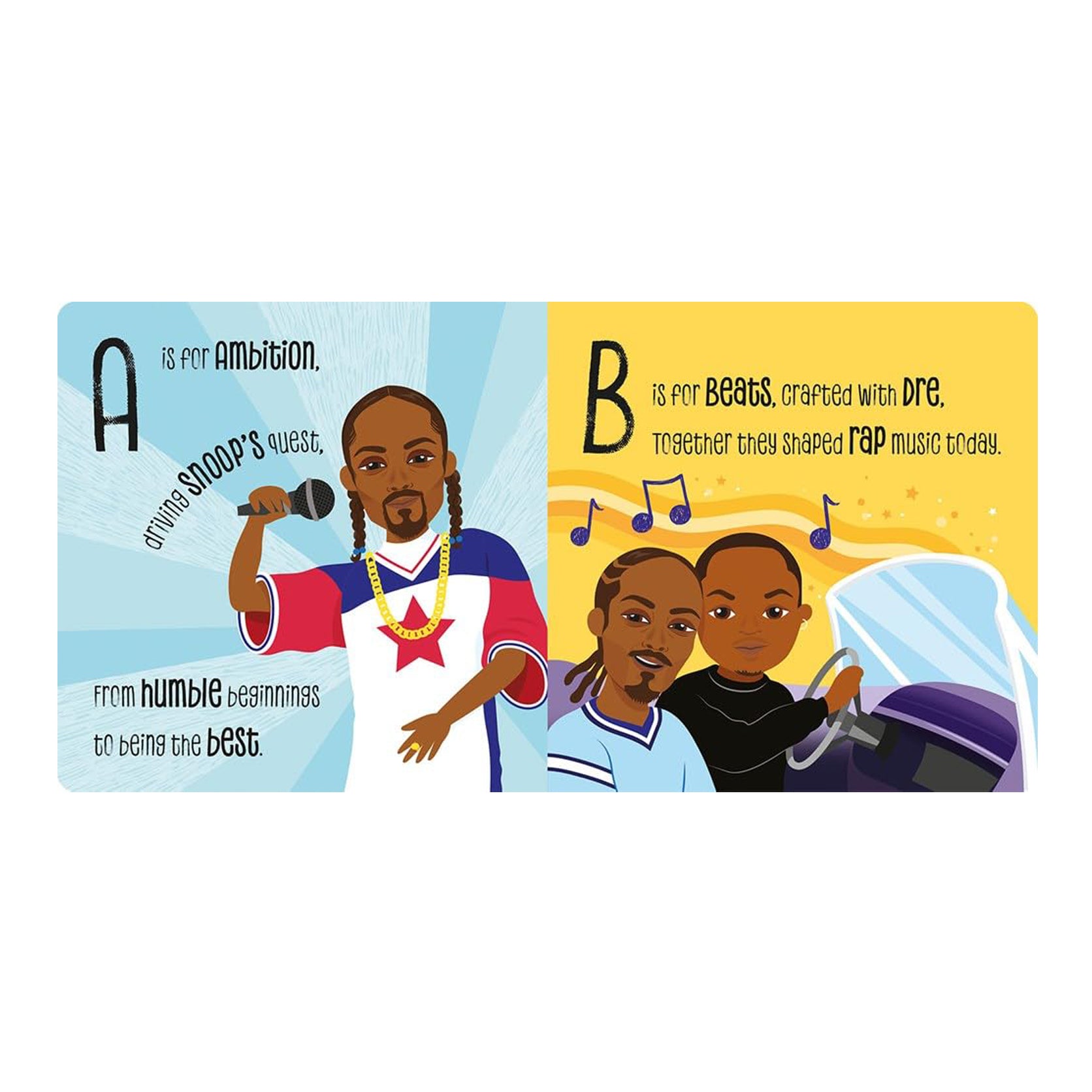 Celebrate legends who changed the world by singing along to rhyming ABC lullabies. A is for Ambition, driving Snoop's quest, From humble beginnings to being the best. B is for Beats, crafted with Dre, Together they shaped rap music today. C is for Cadillac, cruising with flair, Bouncing up and down in the Cali air. Young children will love this vibrantly illustrated first biography and so will Snoop fans of all ages!