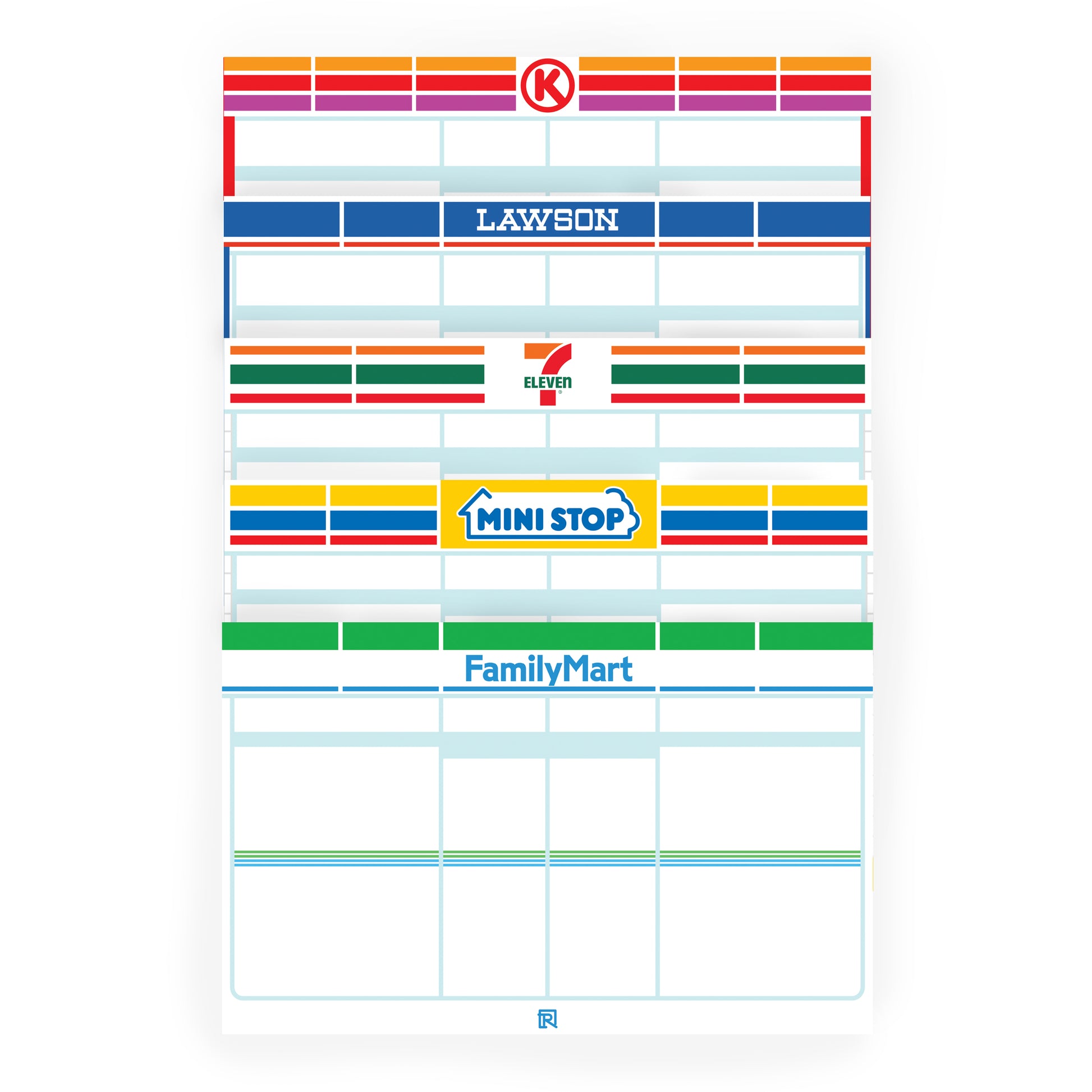 Japanese Convenience Store pack comes with x50 blank eggshell stickers, containing x5 mixed Designs featuring 711, Familymart, Lawson, Circle K and Ministop. Artwork printed on quality Egg Shell stickers printed by BYP @backyardprints and designed by @kalis_one.